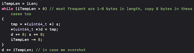 Below this code would normally be a call to memcpy() to copy iLen bytes from *s to *d, but that would not be the fastest way to go. If you are familiar with memcpy(), you know that it is a complex function which is highly optimized for the target CPU because it's used by so many programs in many places. The only downside to calling memcpy() is when the number of bytes to copy is small. There is inherent overhead in the call/return part of using code from the C runtime library, but beyond that, memcpy() tests the byte alignment of the source and destination pointers as well as the requested copy length to see how many bytes (e.g. in SIMD registers) can be moved at a time. I've tested the speed of memcpy() on various machines and I've seen a common cutoff length of about 128 bytes where the benefit of using memcpy() outweighs doing your own copy loop. For GIF decoding, the majority of strings are only a few symbols long, so using memcpy() doesn't make sense. The majority of GIF codes tend to be less than 4 symbols long. There's also the fact that writing a byte at a time is slower than writing the native word size, but that creates potential unaligned write and buffer boundary issues. For x64 and aarch64, memory alignment is not a problem. In my library, I allocate the output buffer a little larger than necessary to solve the potential overwrite problem. Here's my solution for a much faster memcpy() tailored to GIF output: